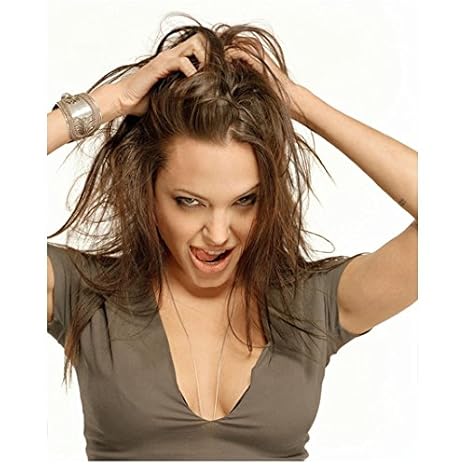 Angelina Jolie Wearing Low Cut Gray Top Head Tilted Down Mouth Open